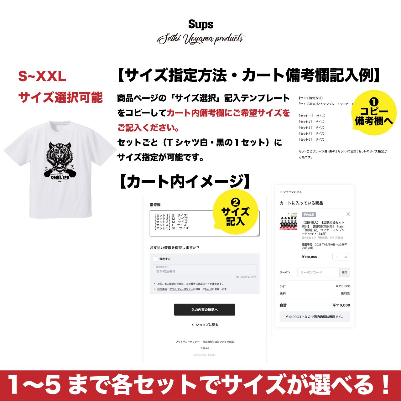 カート追加時の「種類を選択」で表示される「団体5セット」を選択後カート下段「備考欄」に各セットのサイズ記入をお願いします。